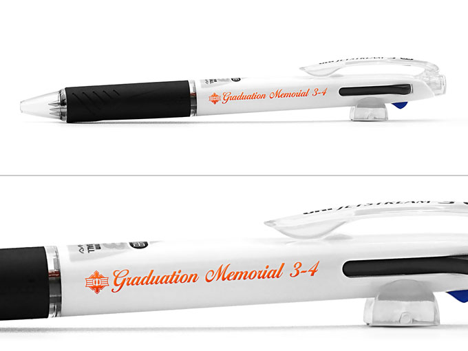 三菱鉛筆(uni)、ジェットストリーム 3色インク 0.5mmへ名入れさせて頂きました。優れた速乾性によりにじみにくいという万能タイプのインクを使用しておりますので、公的書類などの大切な書類にも安心して筆記が出来ます。さらに実用性の高い黒・赤・青の3色インクを搭載しておりますので、ビジネスシーンはもちろん学生さんにも人気があります。卒業記念品としての制作となりますので、校章とクラスナンバーを名入れ致しましたので、生徒さん達へ送る思い出の一本になりました。配布時には傷汚れ防止のOPP袋入れがお勧めです。