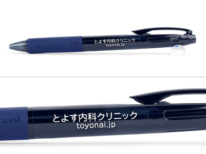 油性でありながら水性のような書き味を実現した三菱鉛筆(uni)ジェットストリーム 3色インク 0.5mmへ名入れ致しました。学生やビジネスシーンに特に人気が高く、実用性の高い黒、赤、青の3色インクを搭載しておりますので、文章などの重要ポイントや目印などに使い分けることが出来るので大変便利です。今回は印刷サイズが縦に広く取れるPAD印刷で製作を致しましたので、二段での校正が可能になりました。院名とURLの様な内容を上下に分ける事でより一層読みやすくなっております。