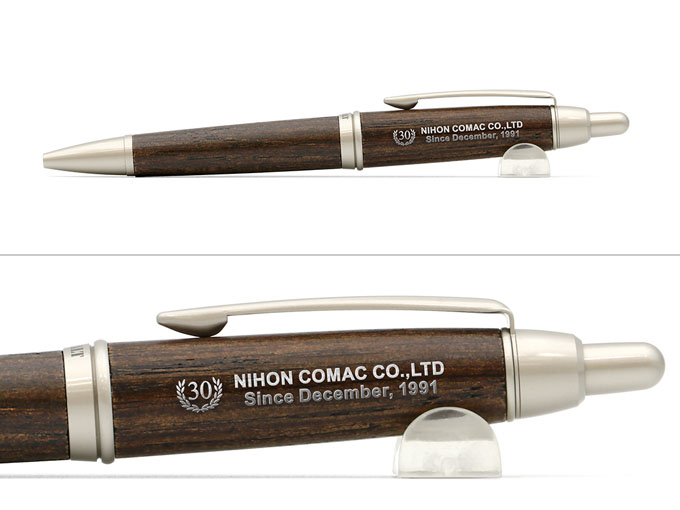 記念品やノベルティ等に適した高級感のある三菱uniのピュアモルト1000 0.7mmへ名入れさせて頂きました。ウイスキー熟成後の樽材を再加工して作られた木製ペンのピュアモルトシリーズ。あたたかく自然な色あいと木のぬくもりを感じさせる質感が手になじみます。エレガントな雰囲気は記念品やビジネスギフトとして贈る名入れボールペンにぴったりです。今回は英数字(角ゴシック)+イラストのデザインとなっており、ダークブラウンに銀の名入れでとても高級感のある素晴らしい仕上がりとなっております。ボールペンは、のし箱箱入れで納品致しました。