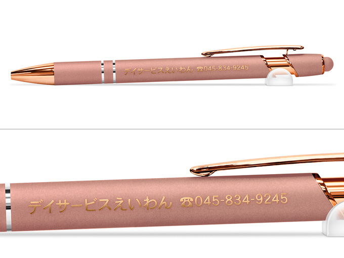 スマートフォン・タブレットに便利なタッチペンがついた本体がピンクゴールドのメッキが美しい、とても存在感のあるデザインのタッチペン付きメタリックONE-DX PG 0.7mmへ名入れさせて頂きました。
