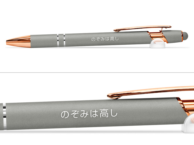 スマホやタブレット操作が出来るタッチペンが付いた機能性抜群のオリジナルボールペン、タッチペン付きメタリックONE-DX PG 0.7mmへ名入れさせて頂きました。手帳、ポケット、ペンケースなどにもすっと収まり使い勝手がよいと人気の名入れボールペンです。