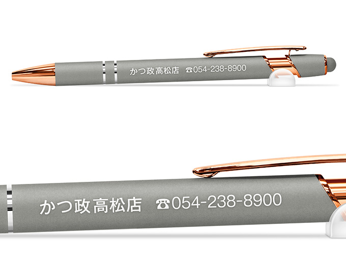 オリジナルボールペン、タッチペン付きメタリックONE-DX PGへ名入れさせて頂きました。スマホやタブレットの操作に便利なタッチペンがついた機能性抜群のボールペンです。ピンクゴールドのメッキが女性に好評頂いております。