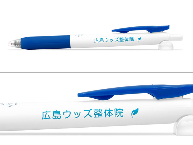 丸みのある「丸ゴシック」の書体に優しい色あいの水色の印刷色が綺麗に入ったボールペンになったかと思います。
