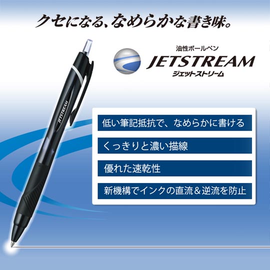 国産ボールペン人気ナンバーワン!くせになるなめらかな書き味でおなじみのジェットストリームシリーズ。その中でも人気の高いラバーボディタイプ。ボールペン自体がラバー素材になっているので持ちやすさは抜群です。世界初の画期的な新開発インクを搭載し、油性でありながら水性のような書き味を実現。優れた速乾性によりにじみにくいという万能タイプのインクを使用しております。また、水性ボールペンのような低粘度のインクを使用することによるインクの漏れや逆流を防ぐスプリングチップ&ツインボール機構を搭載しており、安心してご使用いただけます。本体色はガンメタリック・シルバー・メタリックオレンジと3色ご用意しています。
