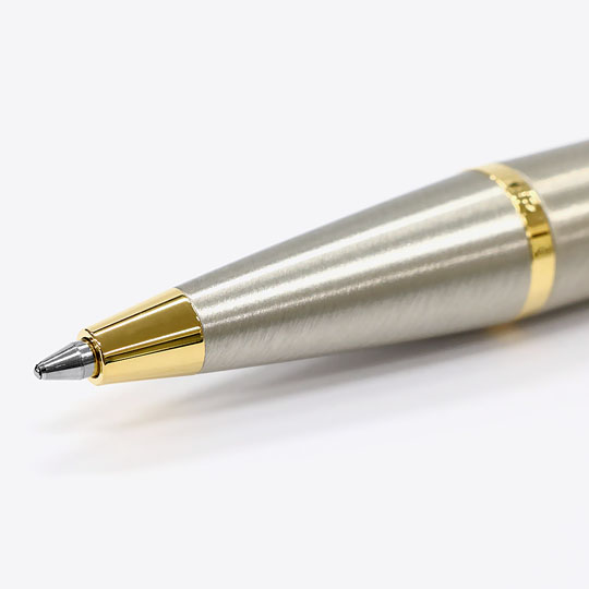 すっきりとシンプルなデザインで美しいフォルムの パーカー・IM GTボールペン。高級ボールペンの代名詞として高い人気があります。しっかりとした重みを感じる大人のボールペンで、特長のあるクリップデザインはポケットに収めた時にさりげないオシャレを演出してくれます。本体は落ち着きのあるシルバーになっておりペン先・ノック部分に金色を施した高級感のある1本になっています。ブランド品のボールペンの中では比較的低価格で手に入るので、高級ボールペンでノベルティを作成したい方や、記念品・ギフトの作成を考えている方にオススメです。