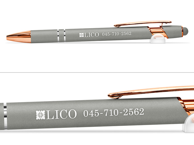 スマートフォン・タブレットに便利なタッチペン付きメタリックONE-DXに、おしゃれな新カラーが登場しました。グレーの本体色にピンクゴールドのメッキが美しく、とても存在感のあるデザインとなっています。グレーの本体部分はシリコン加工で手触りサラサラ、ボールペンの書き味も滑らかで実用性も抜群です。名入れの印刷色は白がおすすめ。読みやすく、本体色とのバランスも良い仕上がりとなります。スタイリッシュなボールペンをお探しの方はぜひタッチペン付きメタリックONE-DX PGをご利用ください!
