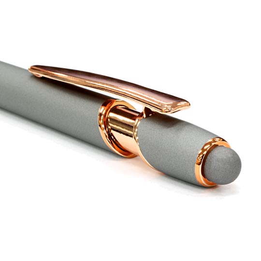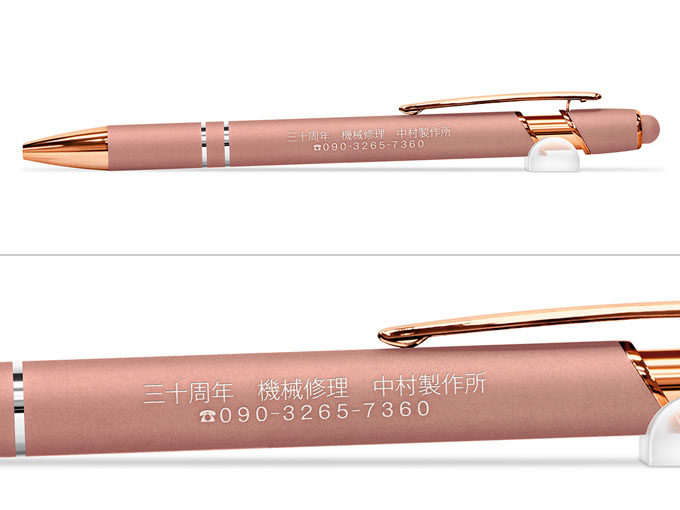 レーザー彫刻名入れ対応のタッチペン付きメタリックONE-DX PGです。文字の色は、「銀」に近い色で彫刻されます。スタイリッシュなデザインとレーザー彫刻の美しい名入れは相性抜群で、より一層高級感がUP。耐久性の高い彫刻名入れに加え、替え芯販売も行っていますので長期間のご使用が可能です。販促効果・宣伝効果も高いおすすめの1本です。