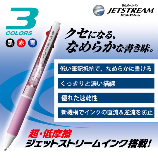 国産ボールペン人気ナンバーワン!くせになるなめらかな書き味でおなじみのジェットストリームシリーズ。左利きでもにじみづらいと評判の三菱UNIのボールペンです。世界初の画期的な新開発インクを搭載し、油性でありながら水性のような書き味を実現。従来の油性ボールペンと比較して最大40%も低い筆記抵抗でなめらかな書き味を実現(三菱UNI調べ)。しかも優れた速乾性によりにじみにくいという万能タイプのインクを使用しております。また、水性ボールペンのような低粘度のインクを使用することによるインクの漏れや逆流を防ぐスプリングチップ&ツインボール機構を搭載しており、安心してご使用いただけます。インク色は黒、赤、青の3色で、それぞれにすらすら書けるインクを搭載。こちらの商品は名入れ文字がよりはっきりと印刷できる名入れ専用のおすすめ商品です。
