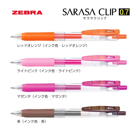 水性インクの軽い書き心地なのに、にじまない。ゼブラが誇る、ゲルインクボールペンNo.1のサラサクリップです。名前の通り、サラっと文字を書くことが出来るので、筆圧の弱い女性の方や、学生から高い人気を集めるボールペンです。芯の太さは0.7mmですので、書類やノート等への筆記やイラストを書く時などに適しています。実用性の高いサラサクリップはノベルティや販促品として多くの方に配る名入れボールペンに最適です。特に学生からの人気が高いので、オープンキャンパスや文化祭などのイベントには、サラサクリップの名入れボールペンがおすすめです。こちらの商品は本体色と同じ色のインクがそれぞれ搭載されております。