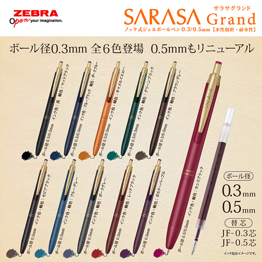 高級感の感じられる大人のサラサグランド 0.5mm(カラーバージョン)が発売しました。金色のクリップは手帳やノート、ポケット等に刺した際に目を引く存在感が御座います。高級感のある本体と挟みやすいクリップは金属製で実現。また本体軸の素材を真鍮からアルミにしたことで、軸の太さは変えずに重量が軽くなり、筆記時の負担も軽減されることが期待できるボールペンになっております。サラサの特徴である、さらさらとしたなめらかな書き味で耐水性にも優れています。