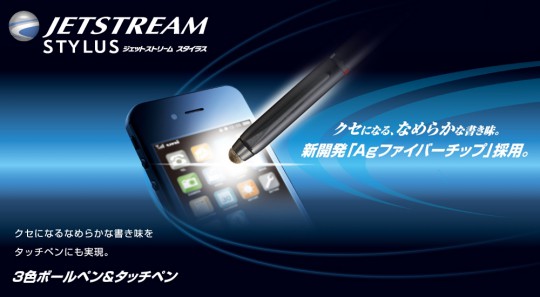なめらかな書き味で定評のあるジェットストリームからタッチペンのついたジェットストリームスタイラス3色ボールペンが登場。クセになる滑らかな書き味はそのままに、3色のボールペンとタッチペンのついた非常に便利な1本になっています。進化したAgファイバーチップを採用し、とても滑らかなタッチ操作感でストレスを感じることなく操作が可能になりました。デジタルにもアナログにもお使いいただくことが出来る静電容量式タッチペンです。