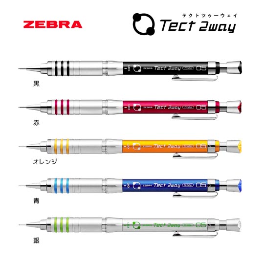 軸中央を右へ回すと振るだけで芯が出るフリシャ機能が使え、軸中央を左へ回すと軸内部の重りが固定され安定した筆記が出来る便利な2WAYタイプのシャープペン ゼブラ テクトツゥーウェイ。フリシャ機能は振るだけで芯が出てくるので、ノックする手間が掛からずスムーズに芯が出てきます。一方フリシャ機能をOFFにするとでペン先にある程度の重さが固定されるので筆跡がずれずに力をあまり加えることなく書くことが出来ます。ノック部分も柔らかくストレスなく押すことが出来ます。さらにペン先は手元が良く見える視界の広い長めの極細先端パイプを使用してますので細かい所への筆記もラクに行える優れたシャープペンです。
