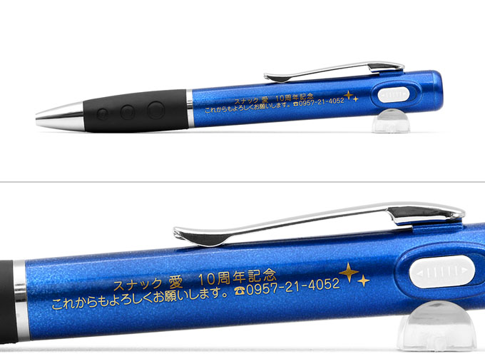 電池やLED電球を搭載しているにもかかわらず、樹脂製ですのでとても軽く扱いやすさも抜群。さらに高級感を醸し出すマット塗装を施しておりますので、一目見ると金属製ボールペンと見間違う質感も魅力的です。0.7㎜の芯はドイツ製のインク使用ですので、書き心地にも納得です。印刷サイズも広く、2行での名入れや企業のロゴやマークの印刷にも適しております。シンプルなデザインに印刷した名前はとても良く目立ち、アピール力があるのでノベルティ・販促品の名入れボールペンにおすすめの1本です。