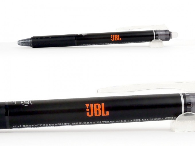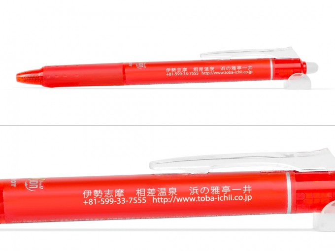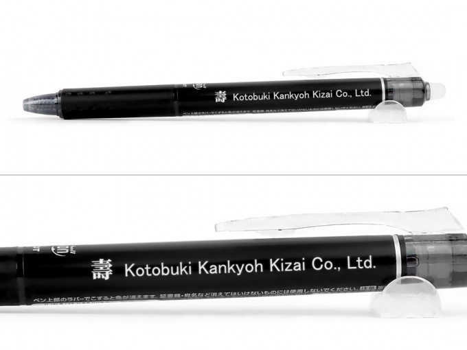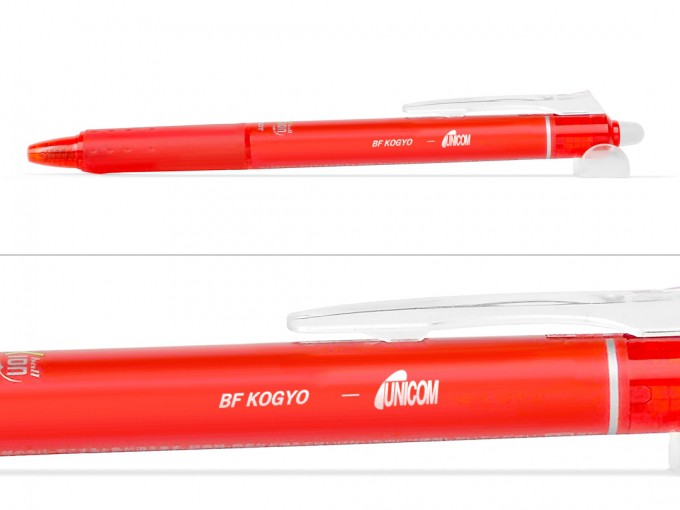 商品の特徴としましては筆跡を専用ラバーでこすることで、インクの色が透明になり消しカスも出ないのでとっても便利です。書いた文字が消える原理としては、このボールペンに使用されているインキは温度が上昇するにつれ徐々に消える特性があり、専用ラバーでこすることによる摩擦熱によって文字が見えなくなります。ビジネスや学業、プライベートまでどんな場面にもお使いいただける人気の商品で、ノベルティや販促品、卒業記念やオープンキャンパスなど、シーンを選ばずご利用いただけます。インク色は9色と豊富に揃っていますのでお好きなカラーで彩りを楽しんで頂けます。名入れボールペンとしての印刷色は黒いボールペンに白、赤、シルバーが人気です。