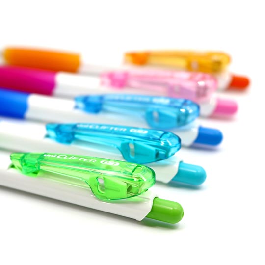 弾力性のあるアルファゲルをグリップに採用しているので、握りやすく手にやさしいくずっと書いていても疲れないボールペン。挟むものの厚みによって、クリップの支点部分がスライドする”支点スライドクリップ”を搭載。挟んだものがクリップの奥まで入ってクリップ全体で固定してくれるので、大切な書類などにも安心して使えます。キュートなボディは白×カラーで名入れがはえるのでノベルティとしても最適です。