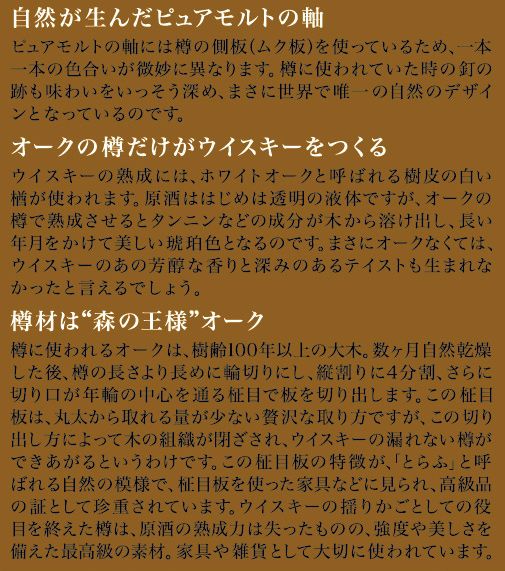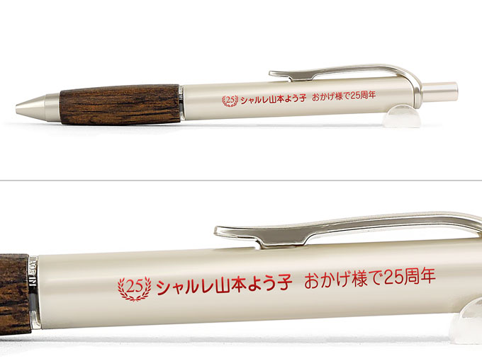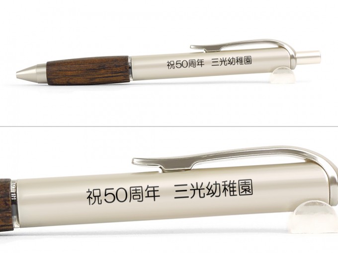 グリップ部分にウイスキー熟成後の樽材を使い、味わいのある趣の木製ペン「ピュアモルト」。木の感触がペンを握った手にやさしいぬくもりを与えてくれる心癒されるボールペンです。天然素材を使用してるため1つ1つの木目や色味が少しづつ変わる味わい深い1本。他にはない商品ですので会社の周年記念品や卒業記念のプレゼントとしても喜ばれるボールペンです。こちらの商品は、名入れ部分が樹脂で製作されているため、ボールペンへの名入れの相性もバツグンです。文字の印刷色は金色と黒が人気。大きな文字を印字できるPAD印刷にも対応しています。