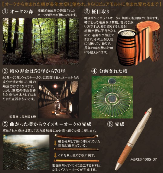| 材質 | (軸)ABS樹脂+塗装 (クリップ)PC樹脂 (グリップ)木(ウイスキー熟成後の樽を再加工) |