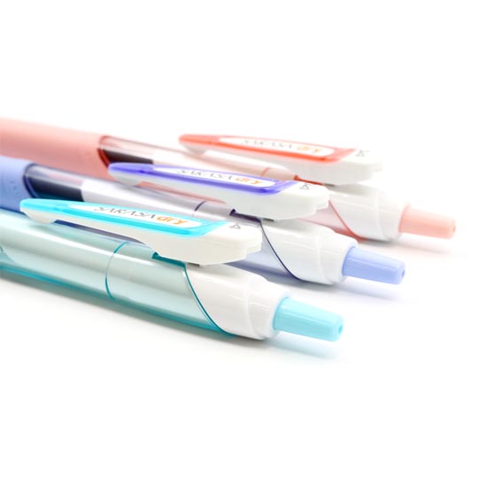 ゼブラのサラサからサラサドライが新登場。最大の魅力は優れた速乾性です。紙に浸透しやすいインクを使用しているので、書いた直後に触れても汚れずすぐインクが乾きます。乾燥時間は従来品に比べ85%も短縮。さらに低粘度のジェル状のインクにしたことで、なめらかな書き心地でくっきりした筆記線を書くことができます。大きく開きやすいバインダークリップを搭載していますので、書類やノート・ポケットに挟みやすく、使い勝手も良いボールペンです。パステルカラーの本体色は可愛いさの中にもどこか上品な雰囲気で、子供から大人まで幅広い年齢層の方に人気です。価格も比較的安めで量産が可能なので、多くの方に渡すノベルティや販促品の名入れボールペンにおすすめの1本です。