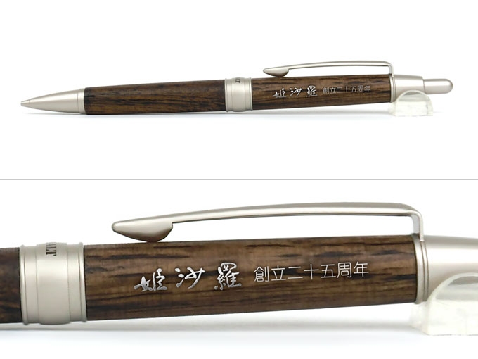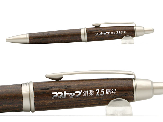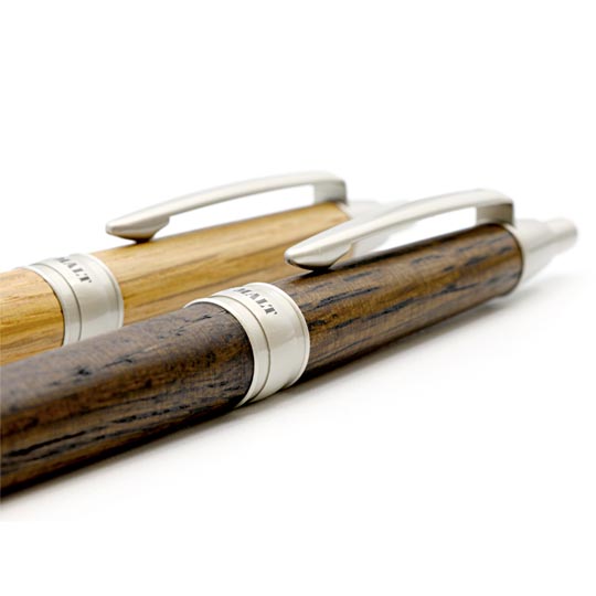 ウイスキー熟成後の樽材を再加工して作られた木製ペンのピュアモルト1000のスリムタイプが登場しました。樽に使われるオークは、美しさと強度に優れる高級素材。その特性を生かして作られるピュアモルトシリーズは、あたたかく自然な色あいと木のぬくもりを感じさせる質感が魅力の1本で、耐久性も抜群です。こちらの商品はスリムタイプで女性の手にも持ちやすく、ポケットにもスッと収まります。天然素材に由来する木目や色あいで、1つ1つ微妙に趣が異なるのもピュアモルトの特徴。高級感たっぷりのデザインで、ノベルティのほかにも記念品やビジネスギフトとして贈る名入れボールペンにぴったりです。名入れの書体は隷書体や丸ゴシック体がおすすめ。金・銀・白の印刷色が人気です。