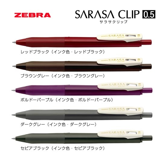 書き心地なめらかなサラサクリップ。数ある中でも今回の商品サラサクリップ 0.5mm (ビンテージカラー)は落ち着いた色合いが大人の方にも好評を頂いております。水性インクよりもにじみにくい特性をもつゲルインクを使用してさらさらとなめらかな書き味となってます。耐水性に優れた水性顔料で、濃く鮮やかな発色が特徴です。インク色に合わせた本体の軸色とアイボリーのクリップが、雑貨調のデザインになっており、クリップに印刷されたキラッと光る金色のロゴが、ビジネスシーンにもマッチします。こちらの商品は本体色と同じ色のインクがそれぞれ搭載されております。