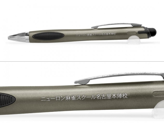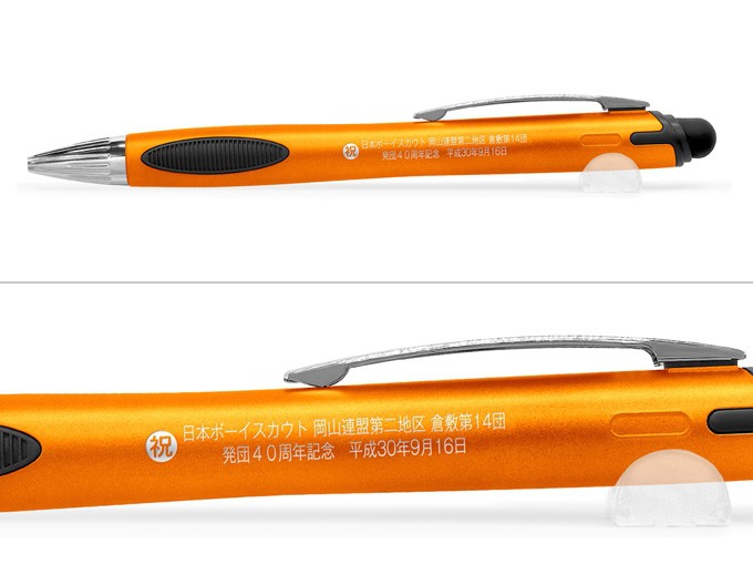 光る印字のインパクトは大きく、社名やロゴをお客様に覚えてもらいやすいのでノベルティボールペンや販促ボールペンとして広告効果絶大です。ボールペンの出し方はペン先をひねると出てくるツイスト式。ボールペン上部のタッチペンを押すとLEDライトが点灯し、名入れ部分が光る仕組みになっています。タッチペン付きでスマホやタブレットに使用でき、実用性があるのも魅力。名入れボールペンとしての使い方も幅広く、例えば夜間に開催するイベントアイテムとしての作成や団体や同好会のオリジナルボールペン作成に。また、多くの企業が参加するイベント・合同展示会・合同説明会などではユニークなノベルティとして他社に差をつけて、効果的なアピールができます。インパクトを重視したい、面白い名入れボールペンを作りたいという方におすすめの商品です。