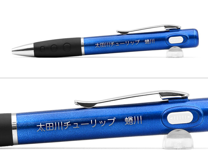 電池やLED電球を搭載しているにもかかわらず、樹脂製ですのでとても軽く扱いやすさも抜群。さらに高級感を醸し出すマット塗装を施しておりますので、一目見ると金属製ボールペンと見間違う質感も魅力的です。0.7㎜の芯はドイツ製のインク使用ですので、書き心地にも納得です。印刷サイズも広く、2行での名入れや企業のロゴやマークの印刷にも適しております。シンプルなデザインに印刷した名前はとても良く目立ち、アピール力があるのでノベルティ・販促品の名入れボールペンにおすすめの1本です。