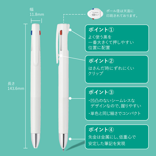 『ブレン3C』は1本で3色使える利便性はそのままに、筆記時の振動を制御したこれまでにないストレスフリーな書き心地を実現しました。従来のボールペンは、書く時に紙とペン先が接触するとその力がボールペン内部にある隙間に伝わり、微細な振動(ブレ)が発生していました。その振動がペンを持つ指に伝わり、気づかないうちにストレスを与えていました。ゼブラはこの振動に注目し、機構を工夫して振動を制御する「ブレンシステム」を開発しました。更に従来の単色のブレンと同じサイズを実現したスリムなボディです。長時間使用しても疲れにくい繋ぎ目がない、シームレスなデザインとなっておりますのでビジネスシーン、プライベートシーン等様々なシーンでお使いいただけます。本体色は柔らかくやさしい色合いとなっています。
