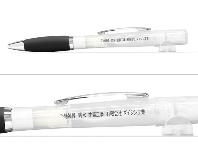 いつでもどこでも気軽にシュッシュ!ボールペンにスプレーがついた便利なボールペンです。香水などを事前にペンの中に入れておくだけで好きな時にスプレーを吹きかけることができます。ペン本体は透明な白色になっているので、中身の残りも一目ですぐに分かります。ボールペンをひねってペン先を出し入れするツイスト式で、ノック部はスプレー機能用になっています。販促品やノベルティとして配ることもできる名入れボールペンです。