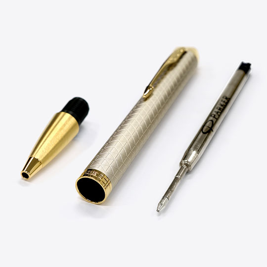 スマートでモダンなデザインと洗練された気品、確かな機能を兼ね備えた人気の「パーカー・IM」から現代性と伝統が融合されたデザインが人気の「パーカー・IM プレミアム」が登場。ペン先・クリップ・リング部分をゴールドプレートで仕上げ、繊細でスタイリッシュなデザインは持つ人の心躍らせるボールペンです。特別な日の記念品や大切な人へのギフトとして幅広く愛されている商品に贈る方のお名前やイニシャルを入れてお届け致します。本体はウォームグレイGT・ブラックGTの2種類からお選びいただけます。