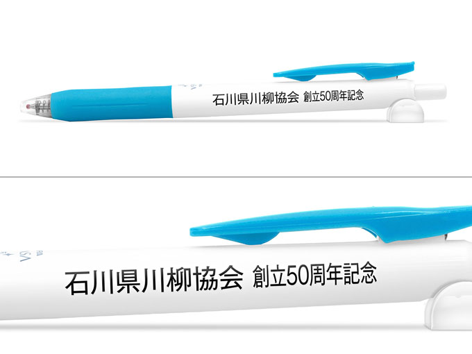 書き心地なめらかなサラサクリップ。ペンの軸・グリップ・クリップ部に細菌の増殖を抑える無機系抗菌剤は配合していますので清潔感が求められる場面にお薦めの名入れボールペンとなっております。水性インクよりもにじみにくい特性をもつゲルインクを使用してさらさらとした書き味となってます。本体のグリップ部分とクリップの両方に鮮やかなカラーを施しホワイト軸を更に引き立たせています。可動式バインダークリップ搭載で厚みのあるものもはさめて実用性にすぐれた人気の商品です。学生に人気の高いサラサシリーズになっていますので、学生向けのイベントや学校関係等にとてもおすすめできるボールペンです。