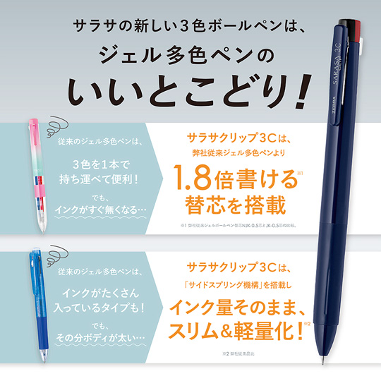 さらりとした書き味で人気の高いゼブラ・サラサクリップシリーズから、ボディをスリム化した「サラサクリップ3C」が登場致しました。