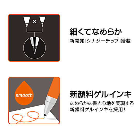 手帳やノートに細かい文字を書きたい方に適した独自開発のペン先「シナジーチップ」を採用しておりますので、なめらかな書き味、書き出しがスムーズと使いやすさも抜群です。