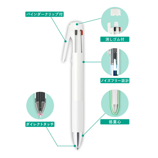 ゼブラ独自の「ブレンシステム」を搭載した5機能ペン ブレン4+Sが新登場致しました。ブレンシステムとは①各パーツの隙間をなくしペン内部のブレを防ぐ「ノイズフリー設計」、②金属製のオモリをグリップ内部に入れ重心を下げることで筆記のブレを防ぐ「低重心」、③ノックして書く時に中芯をホールドしペン先のブレを防ぐ「ダイレクトタッチ」と3つの機能が搭載され、筆記時のストレスを出来る限り軽減したボールペンとなっております。デザインもシンプルで日常使いにもビジネスにもお薦めです。特に長時間文字を書く時にストレスなく使用して頂く事が出来ます。黒・赤・青・緑の4色ボールペンにシャープペンが付いた多機能ボールペンに会社名などを印刷して販促品や記念品としてお使い下さい。