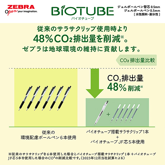 学生から社会人まで幅広い層に人気の高い「サラサクリップ」ですが、ペン本体のグリップにバイオマスプラスチックを使用、その他の部品には再生プラスチックを使用し環境に配慮した「バイオチューブ搭載サラサクリップ」が登場致しました。バイオマスとは「動植物から生まれた、再生可能な有機性資源(石油などの化学燃料を除く)」のことでボールペン使用後に廃棄・焼却する際に放出される「CO₂」の増加を抑えることが出来る環境にやさしい素材となっております。