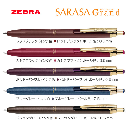 高級感の感じられる大人のサラサグランド 0.5mm(カラーバージョン)が発売しました。金色のクリップは手帳やノート、ポケット等に刺した際に目を引く存在感が御座います。高級感のある本体と挟みやすいクリップは金属製で実現。また本体軸の素材を真鍮からアルミにしたことで、軸の太さは変えずに重量が軽くなり、筆記時の負担も軽減されることが期待できるボールペンになっております。サラサの特徴である、さらさらとしたなめらかな書き味で耐水性にも優れています。
