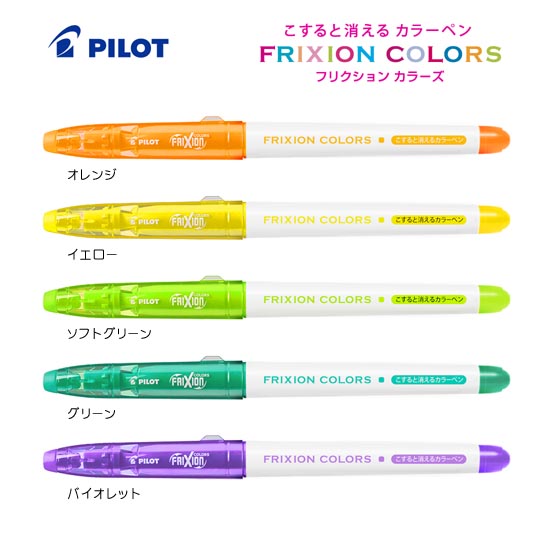何度も書けて何度でも消せるボールペンでおなじみのフリクションシリーズにカラーペンが登場!筆跡が乾いてからキャップ部分についている専用ラバーでこするとインクの色が透明になる特殊インキを使用しています。フリクションカラーズで使われているインキは温度が上昇するにつれ徐々に消える特性があり、専用ラバーでこすることによる摩擦熱によって文字が見えなくなります。ノート、手帳、手紙など様々な場面で使用できます。インク色は本体と同色となっております。