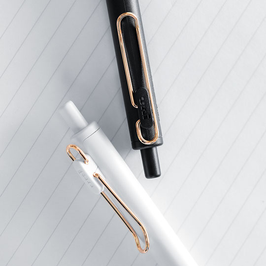 新開発した『uni-ball one(ユニボール ワン)』のインクは、一般的なゲルインクと異なり、色材の紙繊維への浸透を極力抑える、新しい顔料を使用しています。それにより、紙面上の色材が本来の色を発色し、黒はより濃く、カラーはより鮮やかに発色する事が最大の魅力となっております。さらにインクの速乾性も高く、にじみや裏抜けをすることがない為、ストレスなく筆記することが出来ます。シンプルでストレートな軸デザインとなっており機能性も抜群です。手帳に挟みやすいか可動式クリップはローズゴールド仕上げになっていますので、上質で上品な印象となり名入れボールペンにお薦めの1本です。