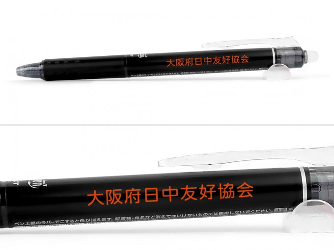 商品の特徴としましては筆跡を専用ラバーでこすることで、インクの色が透明になり消しカスも出ないのでとっても便利です。書いた文字が消える原理としては、このボールペンに使用されているインキは温度が上昇するにつれ徐々に消える特性があり、専用ラバーでこすることによる摩擦熱によって文字が見えなくなります。ビジネスや学業、プライベートまでどんな場面にもお使いいただける人気の商品で、ノベルティや販促品、卒業記念やオープンキャンパスなど、シーンを選ばずご利用いただけます。インク色は9色と豊富に揃っていますのでお好きなカラーで彩りを楽しんで頂けます。名入れボールペンとしての印刷色は黒いボールペンに白、赤、シルバーが人気です。