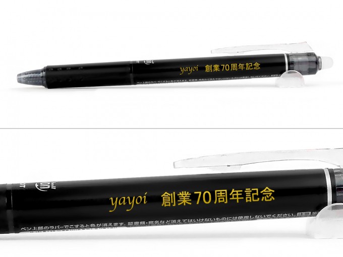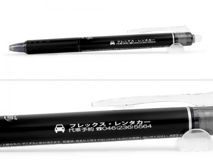 商品の特徴としましては筆跡を専用ラバーでこすることで、インクの色が透明になり消しカスも出ないのでとっても便利です。書いた文字が消える原理としては、このボールペンに使用されているインキは温度が上昇するにつれ徐々に消える特性があり、専用ラバーでこすることによる摩擦熱によって文字が見えなくなります。ビジネスや学業、プライベートまでどんな場面にもお使いいただける人気の商品で、ノベルティや販促品、卒業記念やオープンキャンパスなど、シーンを選ばずご利用いただけます。インク色は9色と豊富に揃っていますのでお好きなカラーで彩りを楽しんで頂けます。名入れボールペンとしての印刷色は黒いボールペンに白、赤、シルバーが人気です。