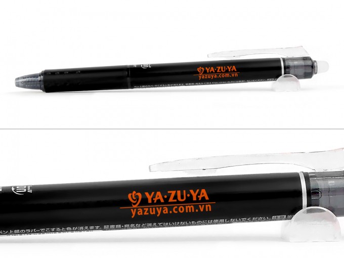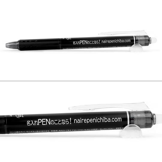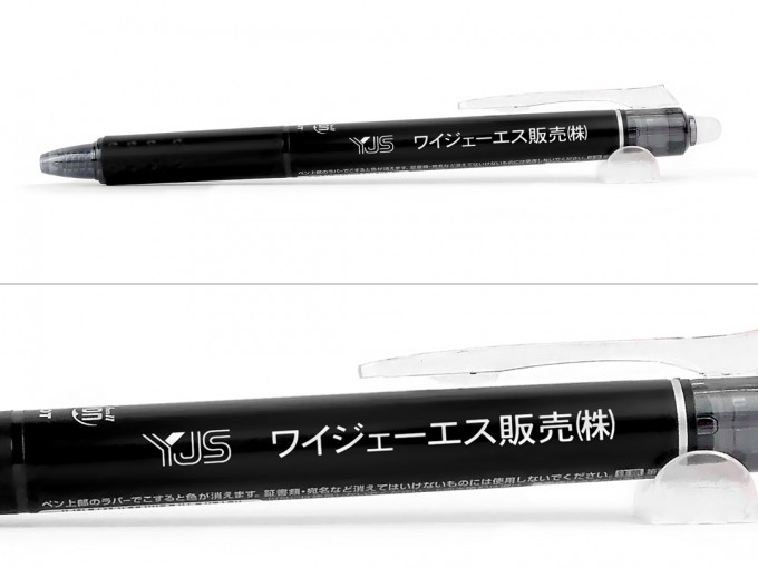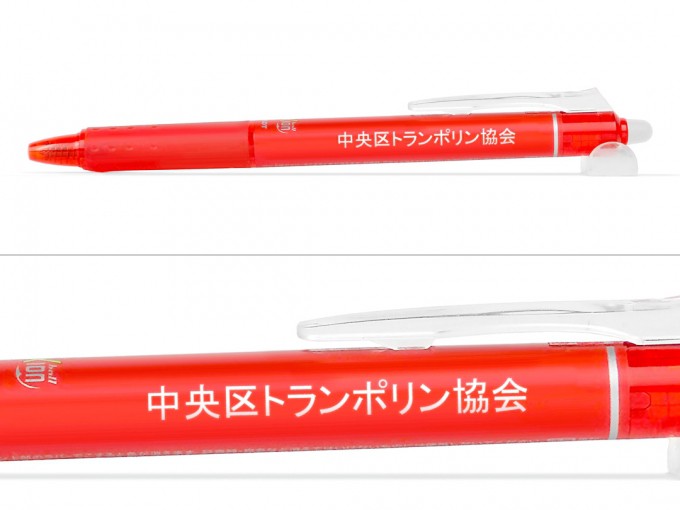商品の特徴としましては筆跡を専用ラバーでこすることで、インクの色が透明になり消しカスも出ないのでとっても便利です。書いた文字が消える原理としては、このボールペンに使用されているインキは温度が上昇するにつれ徐々に消える特性があり、専用ラバーでこすることによる摩擦熱によって文字が見えなくなります。ビジネスや学業、プライベートまでどんな場面にもお使いいただける人気の商品で、ノベルティや販促品、卒業記念やオープンキャンパスなど、シーンを選ばずご利用いただけます。インク色は9色と豊富に揃っていますのでお好きなカラーで彩りを楽しんで頂けます。名入れボールペンとしての印刷色は黒いボールペンに白、赤、シルバーが人気です。