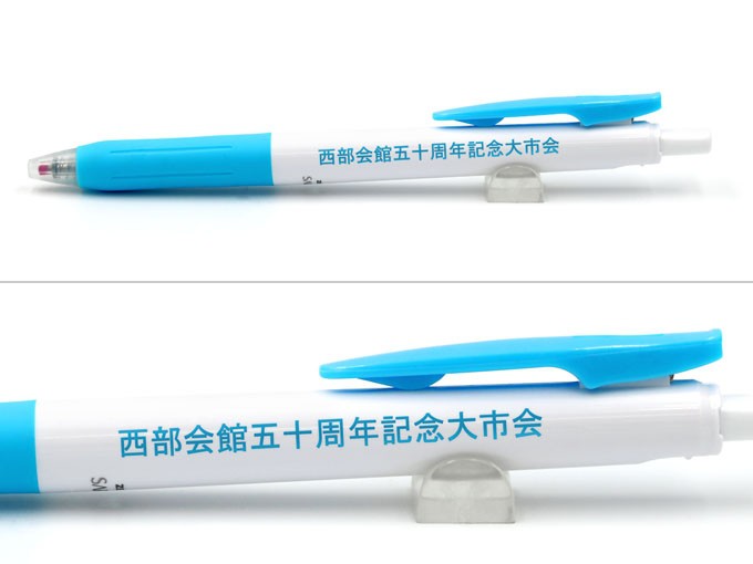 書き心地なめらかなサラサクリップ。水性インクよりもにじみにくい特性をもつゲルインクを使用してさらさらとした書き味となってます。本体のグリップ部分とクリップの両方に鮮やかなカラーを施しホワイト軸を更に引き立たせています。可動式バインダークリップ搭載で厚みのあるものもはさめて実用性にすぐれた人気の商品です。学生に人気の高いサラサシリーズになっていますので、学生向けのイベントや学校関係等にとてもおすすめできるボールペンです。