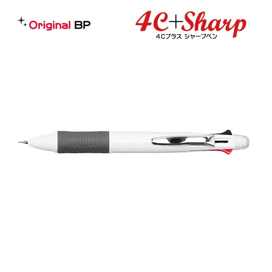 黒・赤・青・緑の4色インクのボールペンにシャープペンのついた多機能ペン。これだけの機能がついてこの価格はとてもお得!名入れボールペン市場のオリジナルボールペンだからご案内可能なお買い得商品です。シンプルでオーソドックスなデザインにちょっと特徴のある形のクリップでアクセントをつけています。本体は名入れが引きたつホワイトカラーなので印刷した名前がより一層目立ち、ノベルティご利用に人気の高い商品です。単色印刷のほかにフルカラー印刷にも対応していますので会社オリジナルのロゴもカラー印刷が出来て、より広告効果の高い名入れボールペンも作ることができます。シャープペンはクリップ部分をノックすると芯が出てくる仕組みになっています。実用性の高い4Cプラスシャープペンは、渡す方にもきっと喜んでもらえるはずです。
