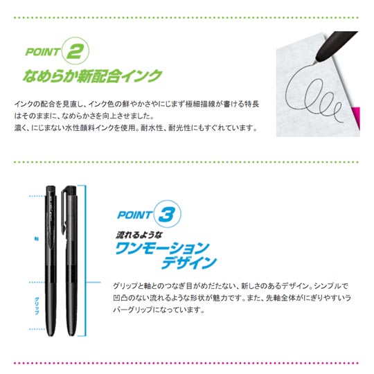 チップ先端の角をなくしたエッジレスチップを搭載してペン先と紙の摩擦抵抗を軽減。それにより、紙面への引っかかりを抑えペンを寝かせて書くような場合でも引っかかりを気にせず書けるようになりました。さらに新配合のインクは色の鮮やかさやにじまない性質はそのままに、なめらかさを向上させた水性顔料インクを採用。耐水性、耐光性にもすぐれています。グリップと軸とのつなぎ目がめだたないシンプルなデザインが魅力的な名入れボールペンです。バリエーションに富んだ本体カラーは10色と豊富なラインナップで、インク色は本体と同色になっています。おすすめの名入れ印刷色は白と銀。どのような本体色でもマッチし、印刷した名前をしっかり目立つように作成できます。