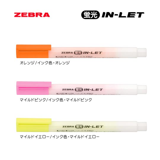 確かな品質のゼブラ商品をお求め安い価格にてご提供。ゼブラの蛍光ペン”インレット”は鮮やかな蛍光色が長く継続。感熱紙に使用しても筆記線の変色が少なく、感圧紙でも文字を隠ぺいすることはありません。カラーは全7色。マイルドピンク・マイルドイエローは淡い色味で目に優しいほんのり蛍光色です。