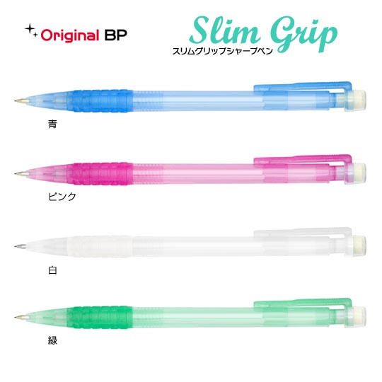 スリムなボディにキュートなカラーのシャープペン。細身の形状にグリップがついているので握りやすく、書きやすさも抜群!やさしい色あいのクリアカラーは特に女性に人気があります。低単価でお求め安いので販促品としてもおすすめの商品です。カラーは青・ピンク・白・緑の4色アソートになっています。