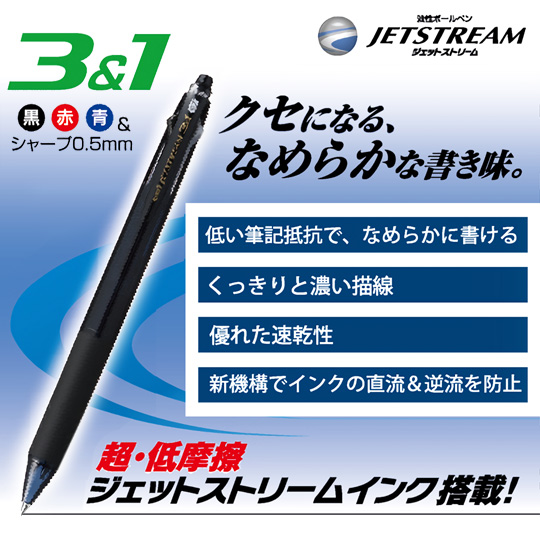 くせになるなめらかな書き味でおなじみのジェットストリームシリーズ。日本が誇る三菱UNIの国産ボールペン。新開発のインクを搭載し、油性でありながら水性のような書き味を実現しています。しかも優れた速乾性により、にじみにくいという万能なボールペン。また、水性ボールペンのような低粘度のインクを使用することによるインクの漏れや逆流を防ぐスプリングチップ&ツインボール機構を搭載しており、安心してご使用いただけます。黒・赤・青と使いやすい3色とシャープペンが付いているとても便利な多機能ボールペンは、ビジネス・学業に役立つ1本です。