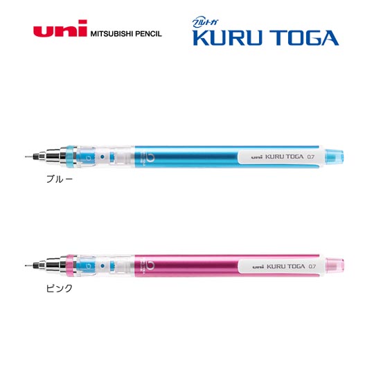 芯先に注目して開発されたクルトガエンジン搭載で学生に高い人気のクルトガシリーズ。書くたびにシャープペンの芯が少しずつ回転し、芯先が均等に磨耗していくように設計されています。芯先が同じ形状で保たれるため、0.7㎜の太い芯でも丸まって潰れたような印象の文字になりません。細い芯に比べて折れにくいので筆圧の強い学生も安心です。本体色はシンプルなデザインのボディにブルー・ピンク2色の爽やかなカラーをご用意しています。10本単位で色が選べるので男子学生はブルー、女子学生にはピンクといった作り方もできます。名入れ方式は単色印刷に加え、印刷範囲の広いPAD印刷にも対応しています。