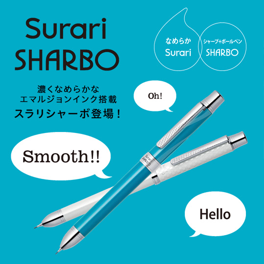 濃く滑らかなエマルジョンインク搭載でスラスラとした筆記感が味わえる多機能ペン スラリシャーボ2000。黒・赤2色のボールペンにシャープペンのついた多機能ペンです。本体を回転することで、ペン先を出し入れすることが出来るロータリーシステムなので、ポケットやカバンの中でペン先が出てしまう心配がありません。ペン先の切替もしっくりと回転し、本体内部のペンがピタッと止まる二段階停止機構の採用でペンのガタつきもなくしっかりとした筆記感が得られます。本体は光沢のあるメタリック調になっていますので、高級感のあるボールペンです。