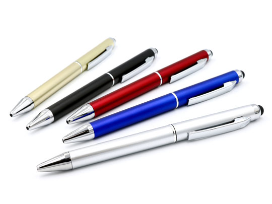 スタイリッシュなボールペンにタッチペンのついた便利な多機能ペン タッチペン付ビジネスペン。名前の通りビジネスシーンにマッチする落ち着いたボディーカラーでおしゃれなボールペンです。上部に搭載されたタッチペンでスマホやタブレットもスマートに操作することができます。ボールペン芯は本体をひねると出てくる回転繰り出し式なので、タッチペンを使っている時に誤ってペン先が出てしまうこともありません。シンプルなデザインでどのような方にも渡しやすく、様々なビジネスシーンでご利用いただける名入れボールペンです。本体色は落ち着きのあるブラックや高級感あるゴールドを初め5色と取り揃えております。