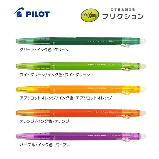 何度書いても何度でも消せる人気のパイロット フリクションシリーズの最もスリムなフリクションボールスリムが登場。温度変化によりインキを無色にするフリクションインキを搭載。専用のラバーでこすることでインキの色が無色に変わり、筆跡を消すことができます。消しカスもでないのでとても便利。ボール径が0.38mmと細いので、細かな書き込みにも適し、スリムなボディはかさばらないのでペンケースにもすっと納まります。
